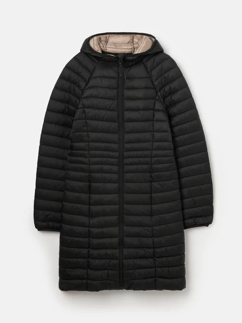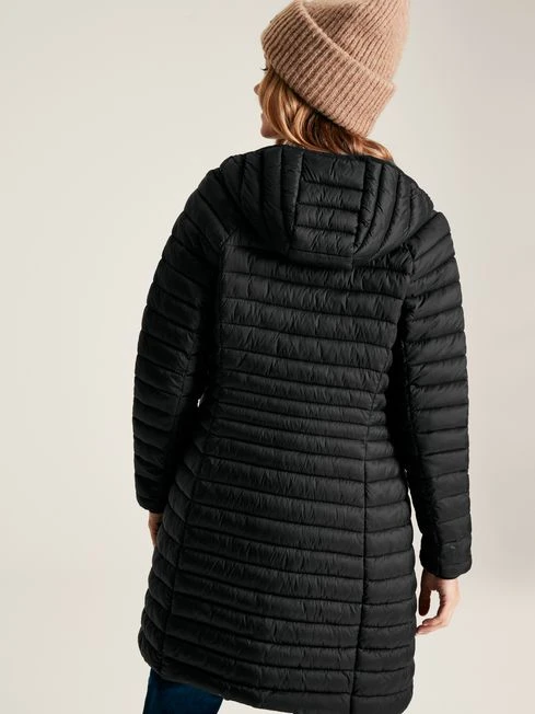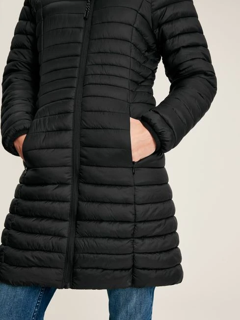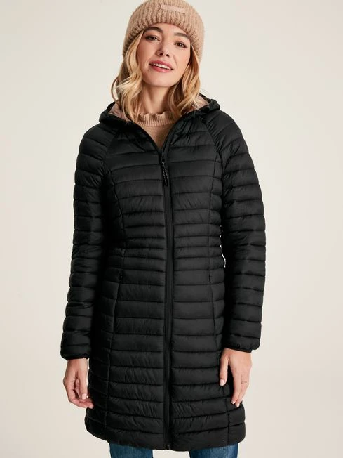 For the unpredictable British weather, you need a jacket that’s predictably reliable. Our longer-style Bramley puffer jacket is perfect for keeping in the car when journeying to your next outdoor adventure, as it packs away into its own pocket for an instant layer of warmth whenever you need it. Unlike other bulkier padded jackets, this one has been designed to fit and flatter, with curved seams and thinner baffles to the waist. The fabric has a buttery soft hand-feel and is showerproof, making it ideal for light bursts of rain. You’ll find a contrast lining with a pearlised finish inside, and we’ve added invisible zip pockets into the side seams. Our Joules hare is printed to the bottom hem – a mark of quality you can always trust. Packs away into internal pocket Longline Hood Showerproof Variagated baffles to flatter the waist Contrast lining Silicone trims Buttery hand-feel Two invisible zip pockets to side seams Length: 92cm (based on UK size 12)