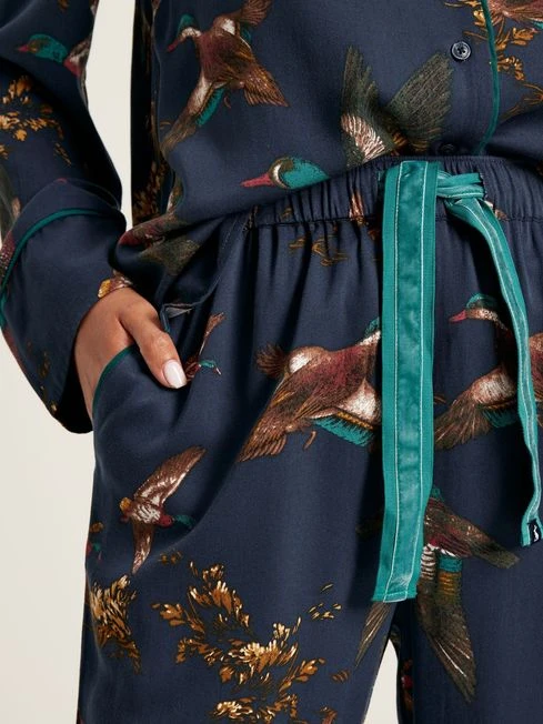 Drift off to dreamland with our ever-so-special Alma pyjama set. The set is crafted from lightweight and breathable viscose and comes with a long-sleeved button-up shirt, complete with a patch pocket and contrasting piped trims. The matching bottoms have a straight fit through the leg, an elasticated waist, luxurious velvet-topped drawcords and slanted side pockets. With a collection of heritage-inspired hand-drawn prints available, you’ll be truly spoilt for choice. Viscose Long sleeves Button-down fastening Patch pocket to the chest Piped trims Velvet topped drawcords Elasticated waist Slanted side pockets Heritage print